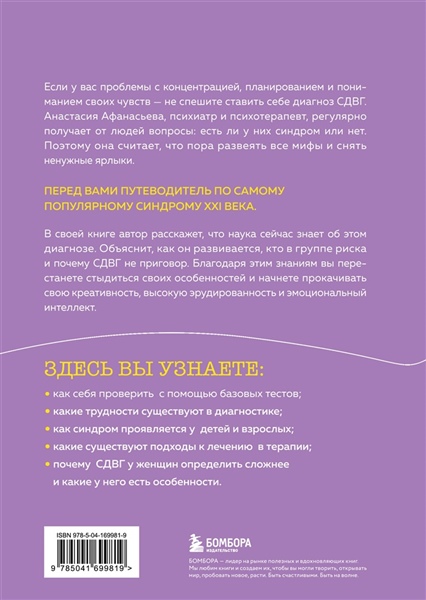 Перед вами путеводитель по самому популярному синдрому 21-го века.В своей книге авторрасскажет, что наука сейчас знает об этом диагнозе. Объяснит, как он развивается, кто в группе риска и почему СДВГ не приговор. Благодаря этим знаниям вы перестанете стыдиться своих особенностей и начнете прокачивать свою креативность, высокую эрудированность и эмоциональный интеллект.