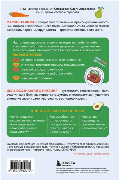 Как научиться прислушиваться к своему телу и выбирать по-настоящему здоровое питание? Специалист по осознанному питанию Маркос Бодоке выделит продукты, приносящие пользу, и продукты, которые разрушают здоровье. Автор расскажет, что на проблему похудения нужно смотреть целостно, и осознанное питание — лучший навигатор для этого.