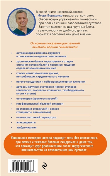 Гимнастика и самомассаж в воде подходят всем, кто имеет проблемы с суставами и заболевания опорно-двигательного аппарата. Известный спинальный нейрохирург и вертебролог Игорь Борщенко собрал более 110 безопасных и доказательно эффективных упражнений, которые избавят вас от боли и помогут восстановить работу позвоночника, плечевого пояса, таза и ног. Методика опирается на физиологические особенности организма: энергичные движения в воде повышают потребление кислорода и улучшают венозный отток, но при этом не перегружают суставы. Чем книга поможет: - Вернёт подвижность и снизит боли в суставах. - Поможет восстановиться после травм и операций благодаря бережному подходу. - Поддержит сердце и сосуды: тренировки в воде дают высокую эффективность в качестве кардио тренировки. - Обучит самомассажу и безопасным приёмам, которые можно выполнять дома — даже в ванной. - Подскажет, как использовать температуру воды, соли и эфирные масла для максимального оздоровительного эффекта. Какие проблемы решит: - Хронические боли в спине, шее, суставах. - Ограничение подвижности после травм или операций. - Перегрузки и боли при плечевых и локтевых синдромах. - Купирование болезненных состояний медикаментами.