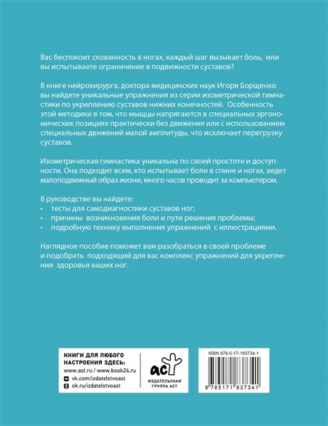 В книге нейрохирурга, доктора медицинских наук Игоря Борщенко, вы найдете уникальные упражнения из серии изометрической гимнастики по укреплению суставов нижних конечностей.Особенность этой методики в том, что мыщцы напрягаются в специальных эргономических позициях, практически без движения или с использованием специальных движений малой амплитуды, что исключает перегрузку суставов. В наглядном руководстве читатель познакомится с причинами возникновения боли, сможет пройти тесты для самодиагностики суставов ног и найдет подробную технику выполнения упражнений с иллюстрациями. Изометрическая гимнастика уникальна по своей простоте и доступности. Она подходит всем, кто испытывает боли в спине и ногах, ведет малоподвижный образ жизни, много часов проводит за компьютером.