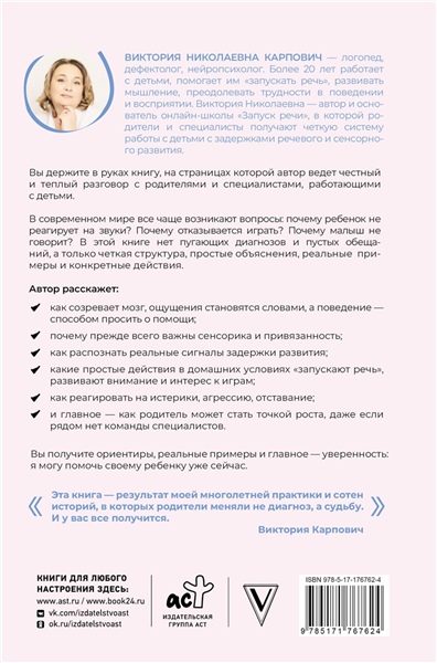 Виктория Николаевна Карпович — логопед, дефектолог, нейропсихолог. Более 20 лет работает с детьми, помогает им "запускать речь", развивать мышление, преодолевать трудности в поведении и восприятии. Виктория Николаевна - автор и основатель онлайн-школы "Запуск речи", в которой родители и специалисты получают четкую систему работы с детьми с задержками речевого и сенсорного развития. Вы держите в руках книгу, на страницах которой автор ведет честный и теплый разговор с родителями и специалистами, работающими с детьми. В современном мире все чаще возникают вопросы: почему ребенок не реагирует на звуки? Почему отказывается играть? Почему малыш не говорит? В этой книге нет пугающих диагнозов и пустых обещаний, а только чёткая структура, простые объяснения, реальные примеры и конкретные действия. Автор расскажет: • как созревает мозг, и ощущения становятся словами, а поведение — способом просить о помощи. • почему прежде всего важны сенсорика и привязанность; • как распознать реальные сигналы задержки развития; • какие простые действия в домашних условиях "запускают речь", развивают внимание и интерес к играм; • как реагировать на истерики, агрессию, отставание; • и главное — как родитель может стать точкой роста, даже если рядом нет команды специалистов. Вы получите ориентиры, реальные примеры и главное — уверенность: я могу помочь своему ребенку уже сейчас. "Эта книга — результат моей многолетней практики и сотен историй, в которых родители меняли не диагноз, а судьбу. И у Вас все получится". Виктория Карпович