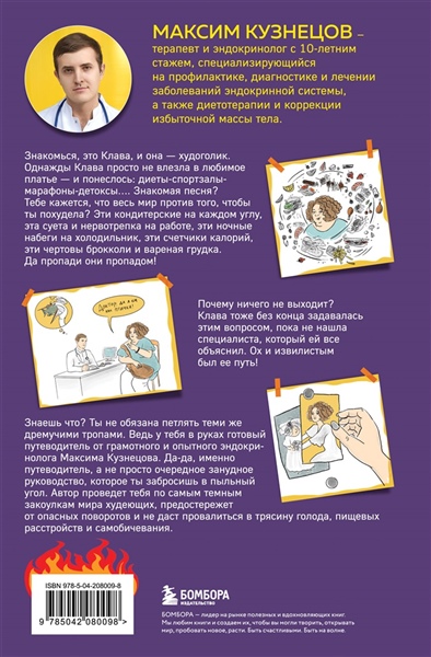 На старт! Внимание! Диета! Представим, тебе нужно срочно сбросить где-то килограммчиков десять за три дня. Что же делать? Какой способ лучше? Их же так много! Кто-то советует модные диеты со странными названиями. Кто-то усердно настаивает на детоксе всего организма, чтобы внутри ни одного шлака и токсина не осталось. Кто-то уверяет, что люди в белых халатах — от дьявола и вообще все эти их «правила тарелки» и «подсчет калорий» — бред. А кто-то уже и не пытается похудеть, смирившись с «плохой наследственностью», «избытком гормонов» или «широкой костью». Максим Кузнецов, эндокринолог с многолетним опытом коррекции лишнего веса, познакомит тебя с Клавой. В этих запутанных джунглях марафонов по похудению, диет, псевдонаучных медицинских теорий и откровенных маркетинговых уловок Клава отчаянно пытается найти самый верный и надежный способ похудеть. Вместе с ней ты преодолеешь тернистый путь похудения, в конце которого тебя ждет фигура мечты, а Максим не только прокомментирует, в чем заключалась та или иная ошибка, но также: · развеет популярные и опасные мифы о питании; · укажет на главные ошибки в похудении; · научит не бояться вкусной еды; · объяснит, где спрятан корень всех проблем с лишним весом; · поможет не только добиться желаемого результата, но и сохранить его навсегда. Эта книга — начало твоей новой жизни, и она в твоих руках!