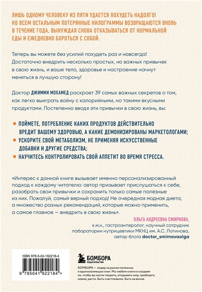 Как бы вы ни ограничивали себя в питании, пытаясь сбросить вес, ваши килограммы все равно к вам вернутся. И, скорее всего, с «процентами»… В этой книге врач-терапевт Джимми Мохамед расскажет вам, как наладить отношения с едой, легко изменить свои привычки и избавиться от лишнего веса навсегда! Автор поделиться простыми советами, которые помогут питаться осознанно, выбирать полезные продукты и перестать зацикливаться на сладостях и перекусах. Вы сможете похудеть без диет, голодания и тренировок! ВЫ УЗНАЕТЕ: • Как похудеть с помощью осознанного питания. • Как избавиться от «эмоциональных» килограммов. • Какими полезными продуктами заменить фастфуд и газировки. • Какие перекусы помогут контролировать аппетит. • Как «настроить» микрофлору кишечника на похудение. «Интерес к данной книге вызывает именно персонализированный подход к каждому читателю: автор призывает прислушаться к себе, разобрать свои привычки и сохранить только самые полезные из них. Пожалуй, самый верный подход! Не очередная модная диета, а множество разных рекомендаций, которые можно применить, а самое главное — внедрить в свою жизнь». — ОЛЬГА АНДРЕЕВНА СМИРНОВА, к.м.н., научный сотрудник лаборатории нутрицевтики МКНЦ им. А.С. Логинова, автор блога doctor_smirnovaolga