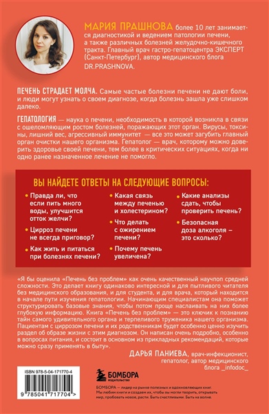 Печень — самый большой внутренний орган и самый уникальный, ведь она способна восстанавливать собственные клетки! Для этого требуется всего лишь 25% исходной ткани.Интересный факт: когда донор отдает часть своей печени больному, его [донора] печень полностью самовосстанавливается спустя всего две недели! Но как же не довести свою печень до такого состояния, чтобы пришлось пересаживать? Об этом расскажет врач-гастроэнтеролог и гепатолог Мария Прашнова. Вы узнаете о самых распространенных (гепатиты, цирроз, жировой гепатоз, опухоли) и не очень заболеваниях печени, узнаете, какие сдавать анализы и принимать лекарства, как ее вылечить или комфортно жить с заболеванием. Автор ответит на часто задаваемые вопросы, расскажет об образе жизни и питании, а также поделится кулинарными рецептами для оздоровления печени. Книга "Печень без проблем" ответит следующие вопросы: Правда ли, что если пить много воды, улучшится отток желчи? Какая связь между печенью и холестерином? Безопасная доза алкоголя – это сколько? Почему печень увеличена? Что делать с ожирением печени? Цирроз печени не всегда приговор? Как жить и питаться при болезнях печени? Какие анализы сдать, чтобы проверить печень? «Я бы оценила "Печень без проблем" как очень качественный научпоп средней сложности. Это делает книгу одинаково интересной и для пытливого читателя без медицинского образования, и для студента, и для врача, который находится в начале пути изучения гепатологии. Для начинающих специалистов она поможет структурировать базовые знания, чтобы потом проще наслаивать на них более глубокую информацию. Книга "Печень без проблем" — это ключик к познанию тайн самого удивительного органа и терпеливого труженика нашего организма. Пациентам с циррозом печени и их родственникам будет особенно ценно изучить раздел об образе жизни с этим диагнозом. Он написан очень подробно, особенно в вопросах питания, и состоит в основном из прикладных рекомендаций, которые можно сразу применять в быту. С уверенностью и искренне рекомендую книгу к прочтению всем, кто взял ее в руки и читает этот текст!» — Дарья Паниева, врач-инфекционист, гепатолог, автор медицинского блога _infodoc_