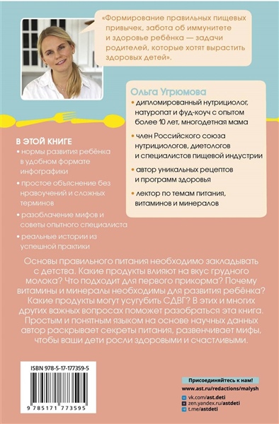Формирование правильных пищевых привычек — это основа здорового образа жизни. В этой книге собрана самая актуальная информация, которая поможет заложить основы правильного питания с самого рождения и выстроить индивидуальную стратегию развития для вашего малыша. Ольга Угрюмова — известный нутрициолог и мама двоих детей, делится своим опытом и даёт подробные рекомендации, доказанные многочисленными научными исследованиями. Как вводить первый прикорм, какие витамины и минералы необходимы ребёнку, как поддерживать иммунитет, какие продукты облегчат орви — ответы на эти и многие другие важные вопросы превращают издание в настоящую энциклопедию здоровья. Для широкого круга читателей.