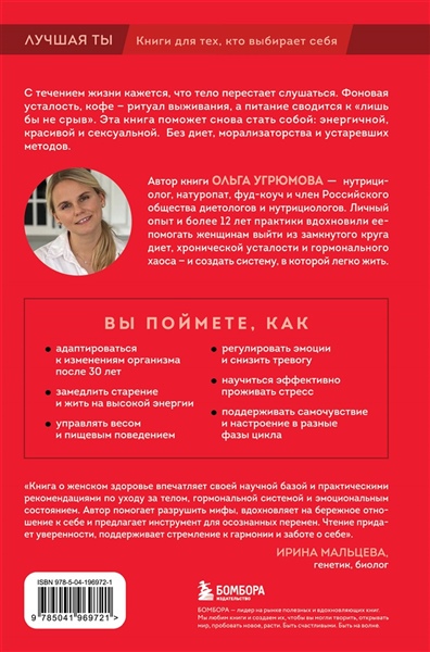 Слабость, отеки, ломкость волос, сниженное либидо и нарушение менструального цикла – лишь некоторые из симптомов, которые могут поджидать в коварном возрасте «милфы». Задумывались ли вы, что сами можете управлять своим состоянием? Наверняка, но как именно – расскажет Ольга Угрюмова,дипломированный нутрициолог, натуропат и фуд-коуч. Благодаря ее пошаговой методике, вы поймете, как поддерживать себя изнутри – через питание, гормональный баланс, сон и заботу о ментальном здоровье.Вы обнаружите авторские рецепты, 60-дневный план по внедрению новых привычек ичек-листы. Для всех, кто желает вернуть энергию, удовольствие, ясность ума и сильное тело.