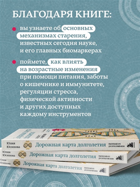 Внутри вас ждут самые популярные антивозрастные диеты, самые эффективные физические нагрузки, правда и мифы о БАДах, реальные способы борьбы с вредоносным стрессом и обязательные чек-апы — все самое важное под одной обложкой.