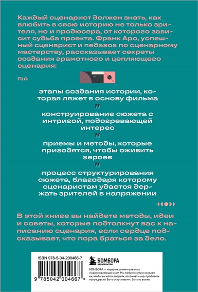 «Кино всегда начинается со слов, именно слова решают, будет ли позволено изображениям появиться на свет». — Вим Вендерс Написать киносценарий так, чтобы в него влюбился зритель — зачастую только половина проблемы. Если сценарист хочет, чтобы его проект был реализован, он должен знать, как понравиться профессиональному читателю, на суд которого неизбежно будет представлен текст. Франк Аро, сценарист и преподаватель сценарного мастерства, предлагает начинающим коллегам выработанную им методику написания (и, что не менее важно, оформления!) сильных историй, которые имеют все шансы понравиться продюсеру, а позже — зрителю. Опираясь на свой сценарный и педагогический опыт, Франк Аро отвечает на основные вопросы, волнующие начинающего сценариста: • Как работает хороший сценарий? • С чего начать, когда у вас есть идея для истории? • На каком этапе работы стоит прописать диалоги? • Почему важно создавать карточки персонажей? • Какие сложности ждут сценариста при работе над коротким метром? Каждый из советов, представленных в этой книге, подкреплен конкретными примерами сценариев разных жанров, от мелодрамы до научной фантастики. В конце концов, не существует такого фильма или жанра, которые бы не соответствовали основным правилам сценаристики. Это компактное, доступное и лаконичное пособие поможет начинающим сценаристам сделать свои первые шаги в профессии, создать грамотный и цепляющий сценарий.