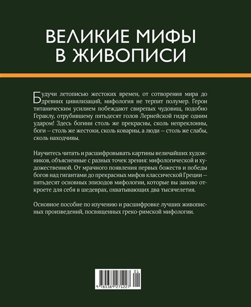В мифологии все страсти напряжены до предела: герои титаническими усилиями побеждают страшных монстров, прекрасные богини непреклонны, боги жестоки и коварны, а люди слабы, но изобретательны. Вся мифологическая история Древней Греции отражена на страницах этой книги, и предана через видение художников разных эпох, что дает старым мифам новые повороты и прочтения. Внимательно изучив «Великие мифы в живописи», можно легко разобраться в греко-римской мифологии, научится читать и расшифровывать картины величайших художников. Автор подробно рассматривает пятьдесят сюжетов: от появления первых божеств до мифа о Сапфо, и иллюстрирует их произведениями искусства, охватывающими почти два тысячелетия!