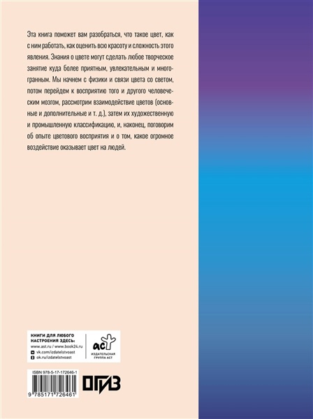 Эта книга поможет вам разобраться, что такое цвет, как с ним работать, как оценить всю красоту и сложность этого явления. Знания о цвете могут сделать любое творческое занятие куда более приятным, увлекательным и многогранным. Мы начнем с физики и связи цвета со светом, потом перейдем к восприятию того и другого человеческим мозгом, рассмотрим взаимодействие цветов (основные и дополнительные и т. д.), затем их художественную и промышленную классификацию, и, наконец, поговорим об опыте цветового восприятия и о том, какое огромное воздействие оказывает цвет на людей.
