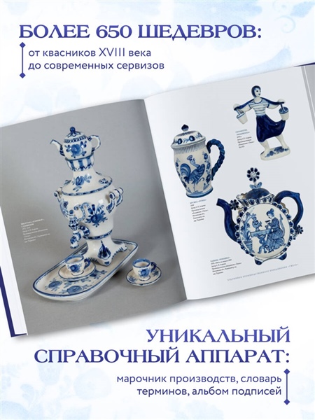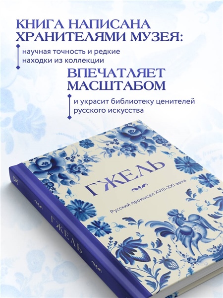 Этот альбом приглашает в захватывающее путешествие по истории знаменитого русского народного художественного промысла. В разделах альбома рассказано об уникальных техниках, элементах декора, приемах росписи, — о том, что создает узнаваемый «гжельский стиль» уже более трех веков.