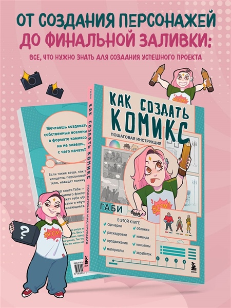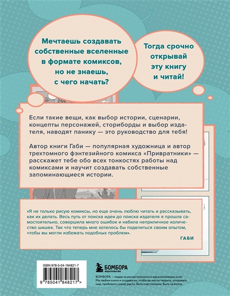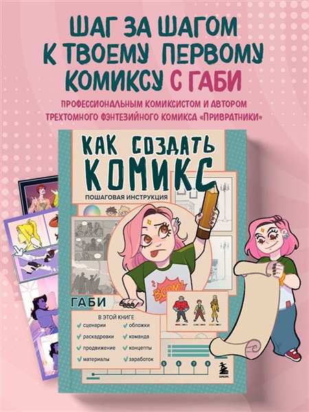 Мечтаешь создавать собственные вселенные в формате комиксов, но не знаешь, с чего начать? Если такие вещи, как выбор истории, сценарии, концепты персонажей, сториборды и выбор издателя, наводят панику — это руководство для тебя! Автор книги Габи расскажет тебе обо всех тонкостях работы над комиксами и научит создавать собственные запоминающиеся истории. Габи — популярная художница и автор трехтомного фэнтезийного комикса «Привратники».