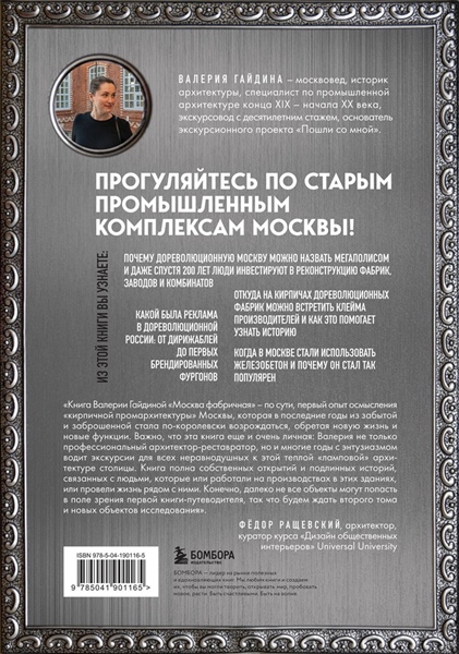 «Книга Валерии Гайдиной "Москва фабричная", по сути, первый опыт осмысления "кирпичной промархитектуры" Москвы, которая в последние годы из забытой и заброшенной стала по-королевски возрождаться, обретая новую жизнь и новые функции. Важно, что эта книга еще и очень личная: Валерия не только профессиональный архитектор-реставратор, но и многие годы с энтузиазмом водит экскурсии для всех неравнодушных к этой теплой "ламповой" архитектуре столицы. Книга полна собственных открытий и подлинных историй, связанных с людьми, которые или работали на производствах в этих зданиях или провели жизнь рядом с ними. Конечно, далеко не все объекты могут попасть в поле зрения первой книги-путеводителя, так что будем ждать второго тома и новых объектов исследования». — Фёдор Ращевский, архитектор, потомок архитектора Ф.О. Шехтеля, Куратор курса «Дизайн общественных интерьеров» Universal University