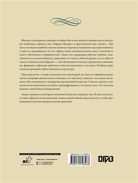 Фиалка и плод граната, единорог и собака, бык и лев, попугай и павлин, весы и жемчуг, рог изобилия и зеркало, знак "Зеркало Венеры" и христианский знак "ихтис"… Как часто мы видим подобные знаки и символы в картинах известных мастеров и даже не задумываемся, что эти образы имеют дополнительный смысл, отличный от своего собственного, поверхностного. Смыслы знаков и символов почти невозможно случайно "расшифровать", их нужно знать. И в этом вам поможет новая книга Натальи Кортуновой — известного искусствоведа, старшего научного сотрудника ГМИИ им. А. С. Пушкина, куратора ряда выставок в ГМИИ.