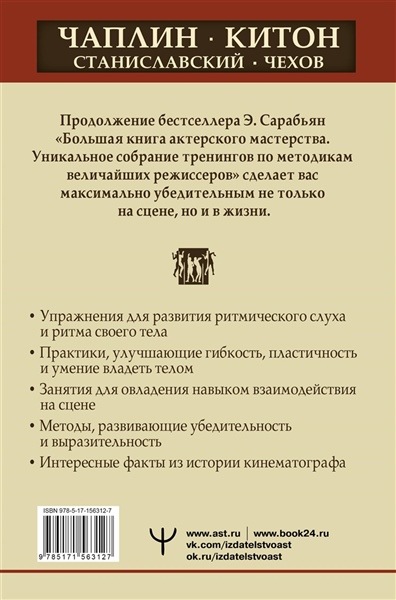 Эта книга — продолжение знаменитой книги Э. Сарабьян "Большая книга актерского мастерства. Уникальное собрание тренингов по методикам величайших режиссеров" — содержит еще больше заданий и упражнений. Тренинг построен на не имеющих аналогов методах признанных гениев немого кино Чарли Чаплина и Бастера Китона, а также классиков театрального искусства Константина Станиславского и Михаила Чехова.