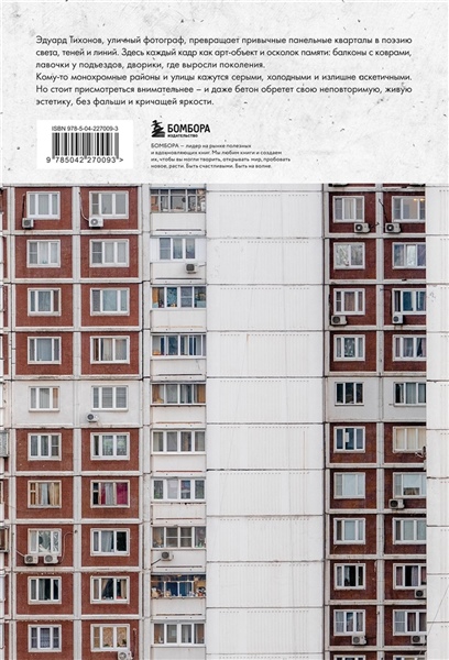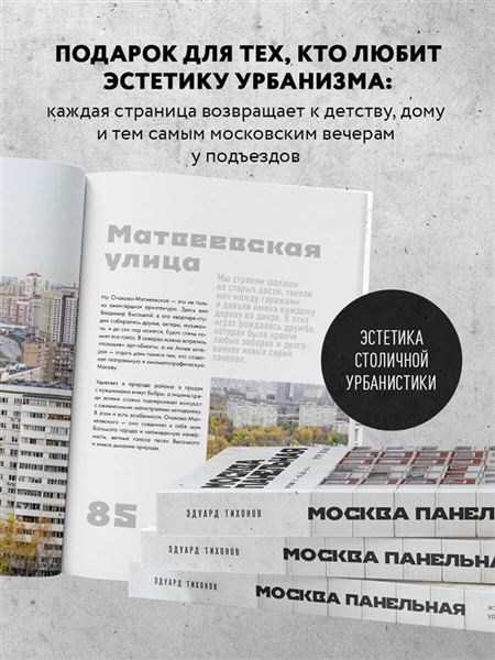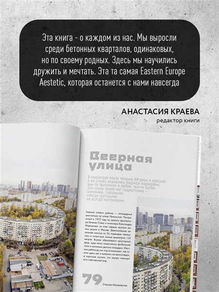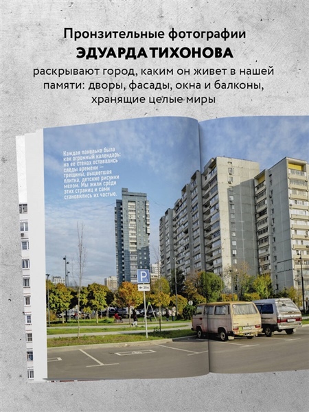 Эта книга — уникальный подарок для тех, кто ценит городскую эстетику, уличную фотографию и честный взгляд на жизнь. Каждая страница здесь наполнена ностальгией и неожиданной красотой, которая прячется в типовом жилье. Это издание возвращает нас к воспоминаниям, делает их зримыми и превращает в настоящее искусство.