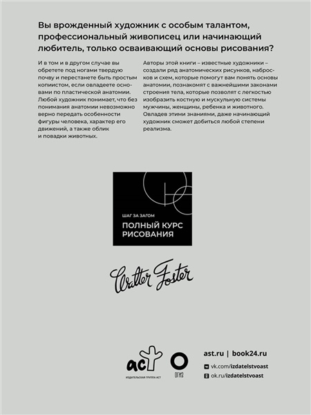 Врожденный ли вы художник с особым талантом, профессиональный живописец или начинающий любитель, только осваивающий основы рисования? И в том и в другом случае вы обретете под ногами твердую почву и перестанете быть простым копиистом, если овладеете знаниями по пластической анатомии. Любой художник знает, что без знания анатомии невозможно верно передать особенности фигуры человека, характер его движений, а также облик и повадки животных.
