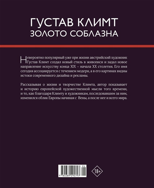 Рассказывая о жизни и творчестве Климта, автор показывает и историю европейской художественной мысли того времени и то как, благодаря Климту и художникам, последовавшим за ним, изменился облик Европы, начиная сВены, а после нее и всего мира.