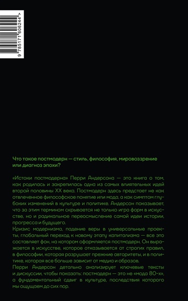 Перри Андерсон детально анализирует ключевые тексты и дискуссии, чтобы показать: постмодерн — это не "мода 80-х", а фундаментальный сдвиг в культуре, последствия которого мы ощущаем до сих пор.