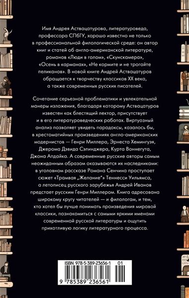 Имя Андрея Аствацатурова, литературоведа, профессора СПбГУ, хорошо известно не только в профессиональной филологической среде: он автор книг и статей об англо-американской литературе, романов «Люди в голом», «Скунскамера», «Осень в карманах», «Не кормите и не трогайте пеликанов». В новой книге Андрей Аствацатуров обращается к творчеству классиков ХХ века, а также современных русских писателей. Сочетание серьезной проблематики и увлекательной манеры изложения, благодаря которому Аствацатуров известен как блестящий лектор, присутствует и в его литературоведческих работах. Виртуозный анализ позволяет увидеть парадоксы, казалось бы, в хрестоматийных произведениях англо-американских модернистов — Генри Миллера, Эрнеста Хемингуэя, Джерома Дэвида Сэлинджера, Курта Воннегута, Джона Апдайка. А современные русские авторы самым неожиданным образом оказываются их наследниками: в уголовном рассказе Романа Сенчина проступает сюжет «Трамвая „Желание“» Теннесси Уильямса, а летописец русского зарубежья Андрей Иванов предстает русским Генри Миллером. Книга адресована широкому кругу читателей — и филологам, и тем, кто хотел бы лучше понимать произведения мировой классики, познакомиться с самыми яркими именами современной русской литературы и ощутить прихотливую логику литературного процесса.