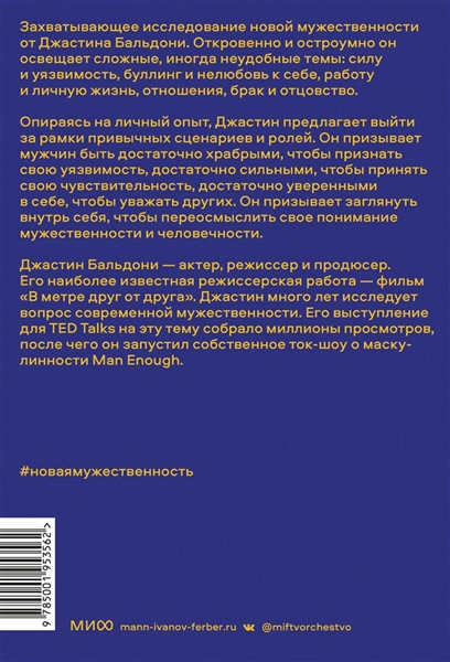 Захватывающее исследование новой мужественности от голливудского актера, режиссера и популярного спикера TED Джастина Бальдони. Откровенно и остроумно он освещает сложные, иногда неудобные темы, включая силу и уязвимость, буллинг и нелюбовь к себе, работу и личную жизнь, отношения, брак и отцовство.
