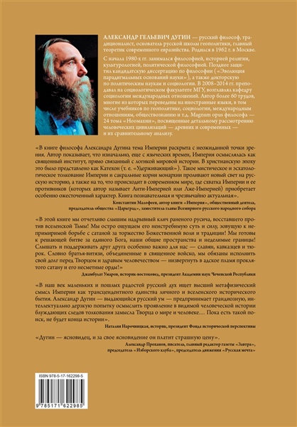 Книга русского философа Александра Дугина представляет собой фундаментальное исследование идеи Империи – в онтологическом, историческом, религиозном, мистическом, эсхатологическом и геополитическом смыслах.Автор подробно разбирает сакральную природу Империи как духовного института в самых различных цивилизациях – древних и современных. Суть драматических современных событий предстает в книге как финальное столкновение Империи и Анти-Империи. Предназначена для широкого круга читателей.