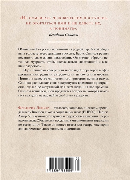 Труды Спинозы произвели революцию в области философии. В далеком XVII веке этот человек предвосхитил приход эпохи Просвещения и современную форму демократии, стал основоположником историко-критического подхода к толкованию Священного писания и заложил основы глубинной психологии. Но прежде всего Спиноза разработал философскую систему, основанную на умении верно направлять свои желания и таким образом достигать истинной радости — систему, полностью изменившую нашу концепцию Бога, морали и счастья. Во многом этот философ опередил не только свою эпоху, но и нашу с вами. Именно это и называется чудом Спинозы. Книга маститого французского автора Фредерика Ленуара предлагает тонкий, блестящий анализ мировоззрения Спинозы, отраженного в его главной работе, «Этика» (1675), и других сочинениях, исследует факты биографии, повлиявшие на формирование его философской системы, и взаимосвязи с современниками. Также в книге приводится ценная переписка автора с Робером Мисраи, одним из крупнейших современных исследователей философского наследия Спинозы.