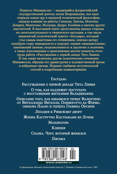В книге представлены разные стороны интеллектуального и творческого наследия флорентийского государственного деятеля и мыслителя эпохи Возрождения Никколо Макиавелли, в том числе знаменитый политический трактат «Государь», который стал самым известным его сочинением, снискал автору недобрую славу имморалиста и породил термин «маккиавелизм», означающий цинизм, вседозволенность и двуличие в политике, а также дополняющая и проясняющая многие моменты этого труда работа «Рассуждения о первой декаде Тита Ливия». В том также включены другие политические сочинения Макиавелли, образцы его драматургии и художественной прозы и избранные письма. Издание снабжено вступительной статьей и подробными комментариями.