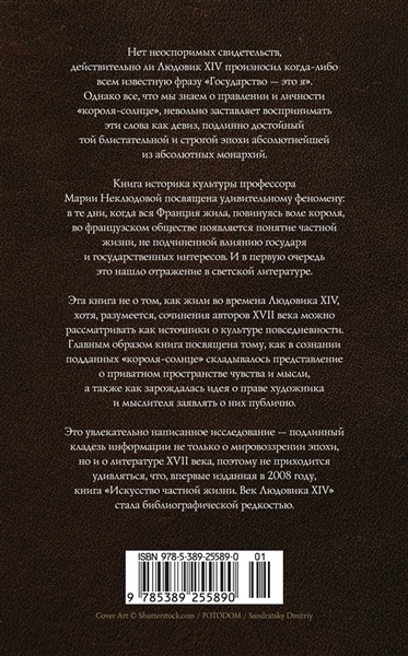 Нет неоспоримых свидетельств, действительно ли Людовик XIV произносил когда-либо всем известную фразу «Государство — это я». Однако все, что мы знаем о правлении и личности «короля-солнце», невольно заставляет воспринимать эти слова как девиз, подлинно достойный той блистательной и строгой эпохи абсолютнейшей из абсолютных монархий. Книга историка культуры профессора Марии Неклюдовой посвящена удивительному феномену: в те дни, когда вся Франция жила, повинуясь воле короля, во французском обществе появляется понятие частной жизни, не подчиненной влиянию государя и государственных интересов. И в первую очередь это нашло отражение в светской литературе. Эта книга не о том, как жили во времена Людовика XIV, хотя, разумеется, сочинения авторов XVII века можно рассматривать как источники о культуре повседневности. Главным образом книга посвящена тому, как в сознании подданных «короля-солнце» складывалось представление о приватном пространстве чувства и мысли, а также — как зарождалась идея о праве художника и мыслителя заявлять о них публично. Это увлекательно написанное исследование — подлинный кладезь информации не только о мировоззрении эпохи, но и о литературе XVII века, поэтому не приходится удивляться, что, впервые изданная в 2008 году, книга «Искусство частной жизни. Век Людовика XIV» стала библиографической редкостью.