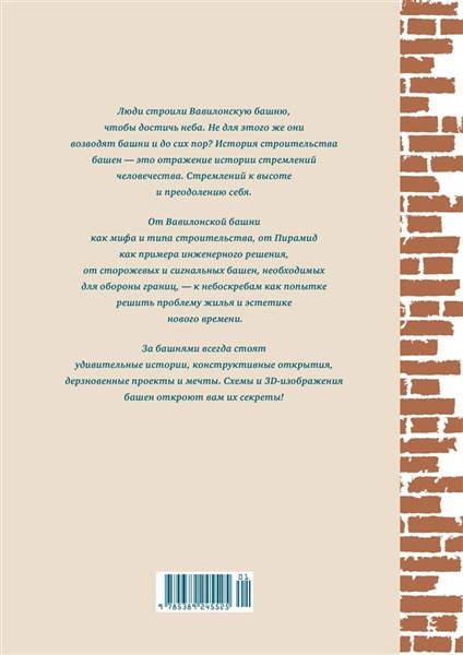 Башня – это квинтэссенция инженерной мыли человека, и его безудержной фантазии. Всемирный атлас башен – краткая история человечества, его устремлений и его достижений. Вавилонская башня, и башня замка Химедзи, Сухарева башня, и Спасская, Пизанская и даже не построенная, но дерзко задуманная башня Татлина… - все башни со схемами, раскрывающими их тайны.