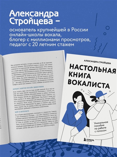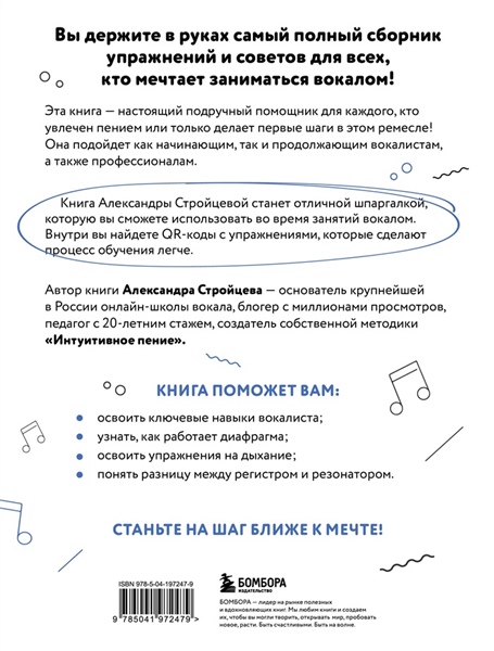Эта книга — настоящий подручный помощник для каждого, кто увлечен пением или только делает первые шаги в этом ремесле! Она подойдёт как начинающим, так и продолжающим вокалистам, а также профессионалам. Книга Александры Стройцевой станет отличной шпаргалкой, которую вы сможете использовать во время занятий вокалом. Внутри вы найдёте QR-коды с упражнениями, которые сделают процесс обучения легче. Автор книги — Александра Стройцева, основатель крупнейшей в России онлайн-школы вокала, блогер с миллионами просмотров, педагог с 20 летним стажем, создатель собственной методики «Интуитивное пение». Книга поможет вам: - Снять все зажимы с голоса. - Найти свой истинный тембр. - Научиться петь высокие ноты. - Освоить главные вокальные приемы. Станьте на шаг ближе к мечте!
