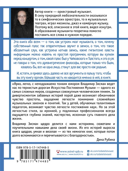 Эта книга обо всем — о том, как устроен мозг музыканта, о том, почему собственный голос так отвратительно звучит в записи, о том, что такое абсолютный слух, как устроена нотная запись, какие гигантские пласты информации можно извлечь из простой программки, которую вы купили перед концертом, о том, какой голос был у Чайковского и Толстого, и это я уж не говорю о том, что древнегреческие философы, которые только что были, казалось бы, все на одно лицо, станут для вас просто как родные.