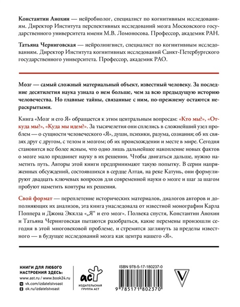 "Константин Анохин —нейробиолог, специалист по когнитивным исследованиям. Директор Института перспективных исследований мозга Московского государственного университета имени М.В. Ломоносова. Профессор, академик РАН. Татьяна Черниговская —нейролингвист, специалист по когнитивным исследованиям. Директор Института когнитивных исследований Санкт-Петербургского государственного университета. Профессор, академик РАО. Мозг – самый сложный материальный объект, известный человеку. За последние десятилетия наука узнала о нем больше, чем за всю предыдущую историю человечества.Но главные тайны, связанные с ним, по-прежнему остаются нераскрытыми. Книга "Мозг и его Я" обращается к этим центральным вопросам: "Кто мы?", "Откуда мы?", "Куда мы идем?". За тысячелетия они сплелись в сложнейший узел проблем — о сущности человеческого "Я", души, психики, разума, сознания; об их связях друг с другом, с телом и мозгом; об их происхождении и месте в мире. Сегодня становится все более ясным, что одно лишь дальнейшее накопление новых фактов о мозге мало продвинет науку в их решении. Чтобы двигаться дальше, нужно наметить путь. Авторы этой книги предпринимают такую попытку. В серии напряженных обсуждений, состоявшихся в сердце Алтая, на реке Катунь, они формулируют двадцать ключевых вопросов для современной науки о мозге и шаг за шагом пробуют наметить контуры их решения. Cвой формат – переплетение исторических материалов, диалогов авторов и дополняющих их анализов, эта книга унаследовала от известной монографии Карла Поппера и Джона Экклза "“Я” и его мозг". Полвека спустя, Константин Анохин и Татьяна Черниговская пытаются разобраться, какие перемены произошли сегодня в этой многовековой проблеме, и стремятся заглянуть за пределы известного — в будущее исследований мозга как центра нашего "Я". "