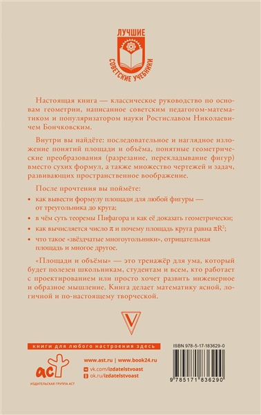Внутри вы найдёте: последовательное и наглядное изложение понятий площади и объёма, понятные геометрические преобразования (разрезание, перекладывание фигур) вместо сухих формул, а также множество чертежей и задач, развивающих пространственное воображение.