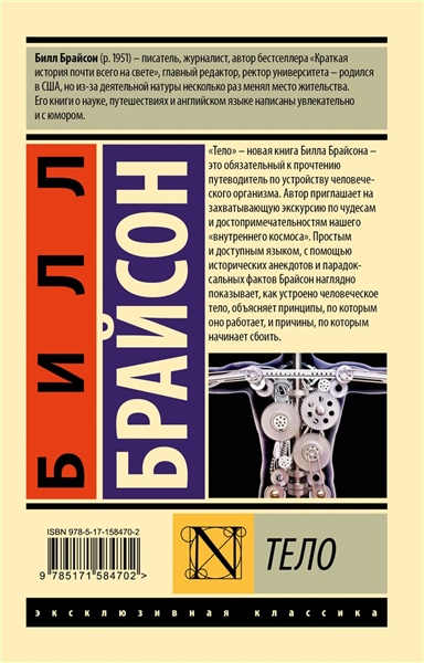 "Тело" — новая книга Билла Брайсона — это обязательный к прочтению путеводитель по устройству человеческого организма. Автор приглашает на захватывающую экскурсию по чудесам и достопримечательностям нашего "внутреннего космоса". Простым и доступным языком, с помощью исторических анекдотов и парадоксальных фактов Брайсон наглядно показывает, как устроено человеческое тело, объясняет принципы, по которым оно работает, и причины, по которым начинает сбоить.