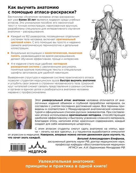 Бестселлер "Анатомия человека: атлас-раскраска" вот уже более 35 лет является лидером среди учебных атласов. Это уникальное пособие: его лаконичный текст и точные иллюстрации, нарисованные вручную, разработаны специально для интерактивного изучения анатомии – раскрашивания. Оригинальный цветовой ключ, визуальные ассоциации и интерактивное обучение проще, интереснее и эффективнее. Выверенная наглядная структура, удобная навигация и краткие поясняющие тексты позволят студентам медицинских вузов выучить анатомию надежно и быстро. Широкий круг читателей сможет связать представления о разных системах и органах в единое целое и разбираться в анатомии человека наравне с профессионалами.