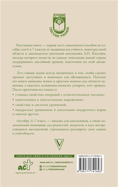 Настоящая книга – первая часть знаменитого пособия по алгебре для 6 и 7 классов от выдающегося учёного, новатора своей области и законодателя школьной математики А.П. Киселёва, методы которого помогли не одному поколению нашей страны поддерживать достойный уровень подготовки по этой дисциплине.