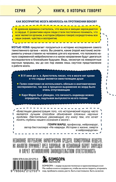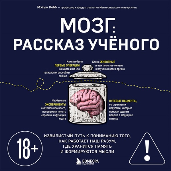 Как менялось наше представление о мозге с древних времен? Если сегодня мозг иногда называют суперкомпьютером, то раньше его сравнивали с часами, телеграфом, телефоном и гидравлическими системами. Профессор Мэтью Кобб описывает невероятные открытия, сделанные в попытках определить функции мозга, а также гениальные и шокирующие эксперименты, которые к ним привели. - Мозг — это орган, который эволюционирует более 500 миллионов лет. - После вскрытия невозможно определить, является ли мозг мужским или женским. - Телеграф раньше являлся моделью для описания того, как работает мозг человека. - Электричество в прошлом использовали для лечения различных видов паралича. «Блестящая демонстрация того, что исторический подход часто является лучшим способом объяснения сложных научных проблем. Настоятельно рекомендую эту книгу тем, кто хочет понять глубины нашего сознания и мозга». — ГЕНРИ МАРШ, профессор, нейрохирург, автор бестселлера «Не навреди. Истории о жизни, смерти и нейрохирургии» «Труд известного популяризатора науки Мэтью Кобба читается на одном дыхании. Он описывает все этапы изучения мозга с древних времен, а также неудачные попытки найти место, где спрятано наше сознание. Перед нами предстанут великие ученые и их открытия, а в завершение автор раскроет возможные пути развития мозга и новых технологий». — МИХАИЛ ТАРДОВ, д. м. н., невролог, ведущий сотрудник ГБУЗ НИКИО им. Л.И. Свержевского ДЗМ