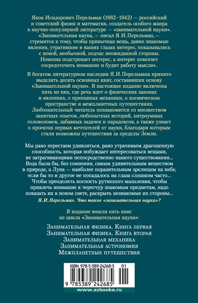 Яков Исидорович Перельман (1882–1942) — российский и советский физик и математик, создатель особого жанра в научно-популярной литературе — «занимательной науки». «Занимательная наука, — писал Я. И. Перельман, — стремится к тому, чтобы привычная вещь, давно знакомые явления, утратившие в наших глазах интерес, показывались с новой, необычной, подчас неожиданной стороны. Новизна подстрекает интерес, а интерес помогает сосредоточить внимание и будит работу мысли». В богатом литературном наследии Я. И. Перельмана принято выделять десять основных книг, составивших основу «Занимательной науки». В настоящее издание включены пять из них, где речь идет о физических законах и явлениях, о принципах механики, о космическом пространстве и межпланетных путешествиях. Любознательный читатель познакомится со множеством занятных опытов, любопытных историй, хитроумных головоломок, забавных задачек и парадоксов, а также узнает о проектах первых мечтателей от науки, благодаря которым стали возможны путешествия за пределы Земли.