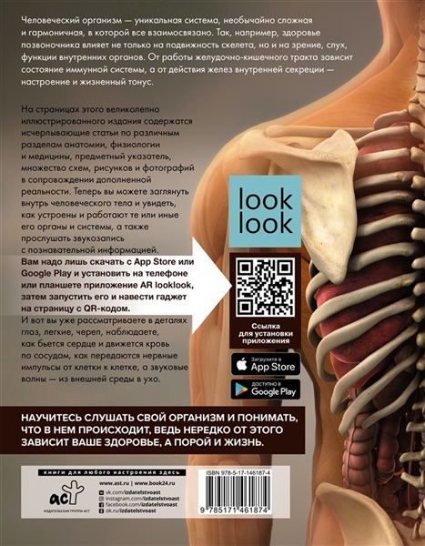 На страницах этого великолепно иллюстрированного издания содержатся исчерпывающие статьи по различным разделам анатомии, физиологии и медицины, предметный указатель, множество схем, рисунков и фотографий в сопровождении дополненной реальности. Теперь вы можете заглянуть внутрь человеческого тела и увидеть, как устроены и работают те или иные его органы и системы, а также прослушать звукозапись с познавательной информацией. Вам надо лишь скачать с App Store или Google Play и установить на телефоне или планшете приложение AR looklook, затем запустить его и навести гаджет на страницу с QR-кодом. И вот вы уже рассматриваете в деталях глаз, легкие, череп, наблюдаете, как бьется сердце и движется кровь по сосудам, как передаются нервные импульсы от клетки к клетке, а звуковые волны — из внешней среды в ухо.