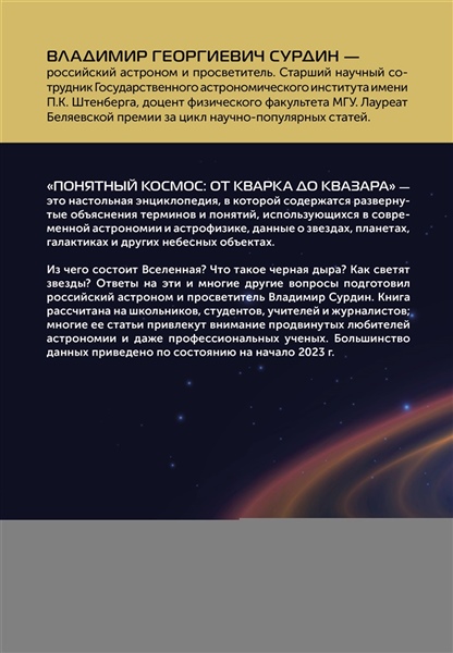 "ПОНЯТНЫЙ КОСМОС: ОТ КВАРКА ДО КВАЗАРА" — это настольная энциклопедия, в которой содержатся развернутые объяснения терминов и понятий, использующихся в современной астрономии и астрофизике, данные о звездах, планетах, галактиках и других небесных объектах. Из чего состоит Вселенная? Что такое черная дыра? Как светят звезды? Ответы на эти и многие другие вопросы подготовил российский астроном и просветитель Владимир Сурдин. Книга рассчитана на школьников, студентов, учителей и журналистов; многие ее статьи привлекут внимание продвинутых любителей астрономии и даже профессиональных ученых. Большинство данных приведено по состоянию на начало 2023 г.