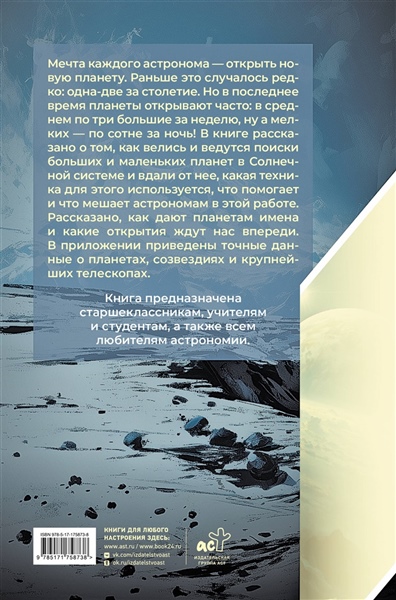 Мечта каждого астронома — открыть новую планету. Раньше это случалось редко: одна-две за столетие. Но в последнее время планеты открывают часто: в среднем по три большие за неделю, ну а мелких — по сотне за ночь! В книге рассказано о том, как велись и ведутся поиски больших и маленьких планет в Солнечной системе и вдали от неё, какая техника для этого используется, что помогает и что мешает астрономам в этой работе. Рассказано, как дают планетам имена и какие открытия ждут нас впереди. В приложении приведены точные данные о планетах, созвездиях и крупнейших телескопах. Книга предназначена старшеклассникам, учителям и студентам, а также всем любителям астрономии.