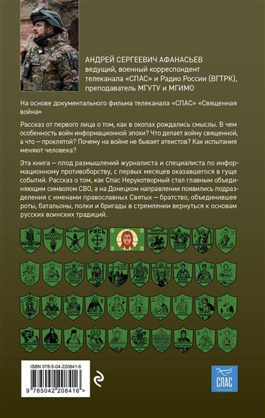 В этой книге автор открывает читателю правду об СВО через личные истории солдат, священников и тех, кто стоит на передовой. От первых разговоров со смертью до крестного хода телеканала «СПАС» вдоль линии фронта — вы увидите, как реальность сталкивается с духовными исканиями и верой. Эта книга — не просто хроника событий, а глубокий рассказ о выборе каждого из нас: быть рабом злобы или участником священной борьбы за правду и защиту. Вы прочитаете о героях с именами святых, военном духовенстве, тайнах фронтовых будней и о том, как человек меняется к лучшему. Если вы хотите понять, что стоит за новостными заголовками, и почувствовать настоящую силу веры и человеческой стойкости — эта книга для вас. «Вы держите в руках книгу, в которой очень редкий взгляд на эту войну: взгляд в Духе Святом. Только в нём эта война открывается как Священная. И только он на самом деле даёт понять главные смыслы и причины драматических событий, которые проживает сейчас наша страна». — Борис Корчевников