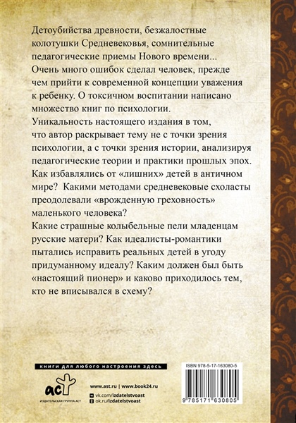 Детоубийства древности, безжалостные колотушки средневековья, сомнительные педагогические приёмы нового времени... Очень много ошибок сделал человек прежде чем прийти к современной концепции уважения к ребёнку. О токсичном воспитании написано множество книг по психологии. Уникальность настоящего издания в том, что автор раскрывает тему не с точки зрения психологии, а с точки зрения истории, анализируя педагогические теории и практики прошлых эпох. Как избавлялись от "лишних" детей в античном мире?Какими методами средневековые схоласты преодолевали "врождённую греховность" маленького человека? Какие страшные колыбельные пели младенцам русские матери? Как идеалисты- романтики пытались исправить реальных детей, в угоду придуманному идеалу? Каким должен был быть "настоящий пионер" и каково приходилось тем, кто не вписывался в схему?