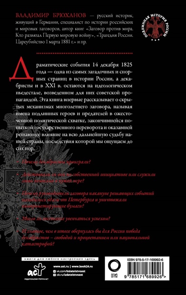 Драматические события 14 декабря 1825 года – одна из самых загадочных и спорных страниц в истории России, а декабристы и в XXI веке остаются на идеологическом пьедестале, возведенном для них советской пропагандой. Эта книга впервые рассказывает о скрытых механизмах многолетнего заговора, называя имена подлинных героев и предателей в ожесточенной политической схватке, закончившейся попыткой государственного переворота и оказавшей решающее влияние на всю дальнейшую судьбу нашей страны, последствия которой мы ощущаем до сих пор. Почему декабристы проиграли? Действовали ли они по собственной инициативе или служили лишь пешками в чужой игре? Почему руководители заговора накануне решающих событий находились вдали от Петербурга и уничтожали компрометирующие бумаги? Почему предводители восстания вообще не явились на Сенатскую площадь? Если декабристы были теми рыцарями без страха и упрека, какими их принято изображать, то почему столь многие из них сломались на следствии, отреклись и покаялись? Могло ли восстание увенчаться успехом? И, главное, чем в итоге обернулась бы для России победа декабристов – свободой и процветанием или национальной катастрофой?