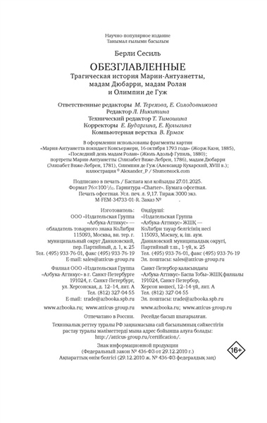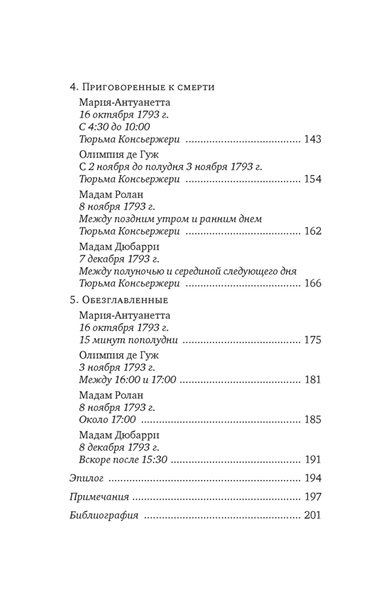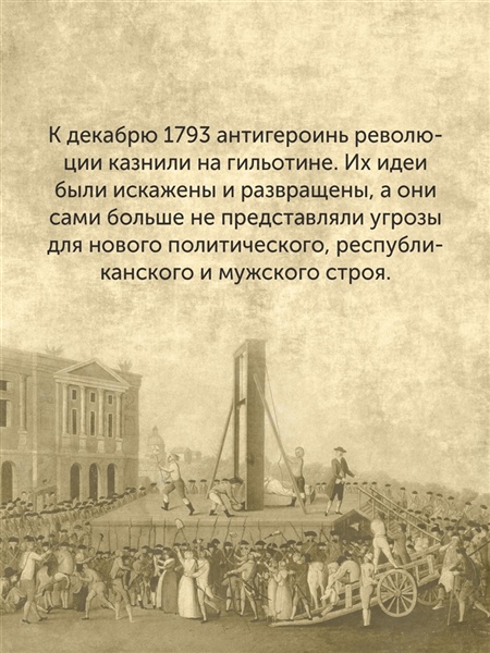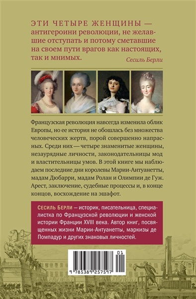 1793 год. В самом разгаре Французская революция, определившая всю дальнейшую историю Европы. Власти Республики судят четырех женщин: законодательницу общественных вкусов мадам Ролан, неутомимую защитницу прав женщин Олимпию де Гуж, расточительную бывшую фаворитку Людовика XV мадам Дюбарри и, наконец, легкомысленную королеву Марию-Антуанетту. Все они пали жертвами революции и ее излюбленного оружия — гильотины. Историк Сесиль Берли во всех подробностях воспроизводит последние дни этих влиятельных, незаурядных и очень разных женщин от ареста до приговора и последующей казни… «Что творилось в головах этих женщин, лишенных свободы и объявленных злейшими врагами политического режима, который зародился в небывалых, исключительных и жестоких условиях? Как они перенесли все публичные унижения и нападки на их личную, даже интимную жизнь? Как они боролись с тюремными ограничениями и страхом смерти? Как готовились к эшафоту? Как постичь эмоции, которые относятся к области недосягаемого?» (Сесиль Берли)