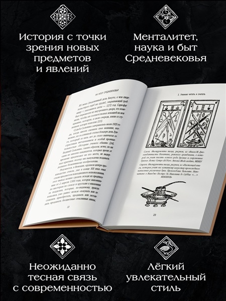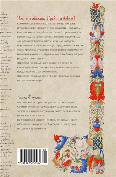 Средние века считались некогда темными веками — время интеллектуального застоя и жестоких нравов. В действительности это было время необычайных культурных новшеств и технологических инноваций. Выдающийся историк-медиевист Кьяра Фругони приглашает нас в удивительное путешествие по дорогам Средневековья, ко всем тем вещам и идеям, которые появились в эту эпоху и имеют важнейшее значение для нас сегодня. Благодаря Средним векам мы приобрели очки, книги, брюки, карты Таро, мельницы и обеденные столы, а у нашего домашнего очага появилась кошка. Само время оказалось покорено и заключено в облик часов на спусковом механизме.