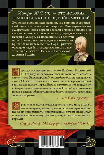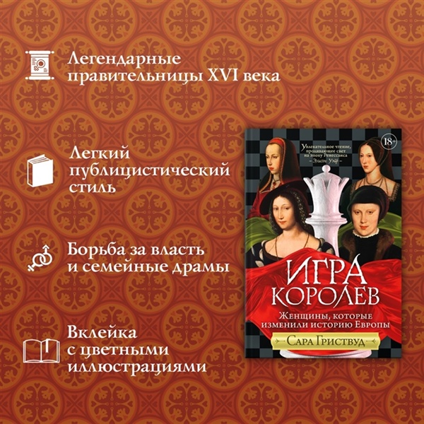 «Летом 1513 года при дворе Маргариты Австрийской появилась девочка — дочь придворного, обученная понимать опасный дворцовый танец. Она знала, что лучшей защитой для девушки служит ее ум, что благосостояние семьи может измениться по прихоти короля и что на европейской политической арене разыгрывается большая шахматная партия, в которой даже она может сыграть определенную роль. Никто, разумеется, не представлял, насколько значительной будет эта роль». (Сара Гриствуд) Анна Болейн и Маргарита Австрийская, при дворе которой она служила и воспитывалась. Луиза Савойская и ее дочь, одна из первых французских писательниц, Маргарита Наваррская. Кристина Датская и Екатерина Медичи, по слухам имевшая страсть к ядам. Это лишь некоторые из знаменитых женщин, которые участвовали в европейской политике XVI века, а зачастую и полностью ее направляли. Эти удивительные правительницы сознательно пользовались своим статусом, чтобы вести дела по-другому, признавали сестринские узы, оказывались пешками в чужой игре и пользовались другими людьми — в собственной. В шахматной партии европейской политики именно королева стала ключевой фигурой. История XVI века — это гамбит королев.