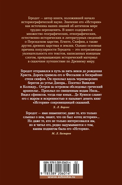 Геродот — автор книги, положившей начало историографической науке. Значение его «Истории» как источника*наших знаний об античном мире трудно переоценить. В книге содержится множество географических, этнографических, естественно-исторических и литературных сведений о Персидском царстве, Египте, Скифии, а также других царствах и землях, в которых обрела свое рождение и смысл культура Западного мира. Однако основная причина неувядающей популярности Геродота — потрясающая увлекательность его текстов, написанных изящным слогом, превращающих исторический материал в сказочное путешествие по Древнему миру.