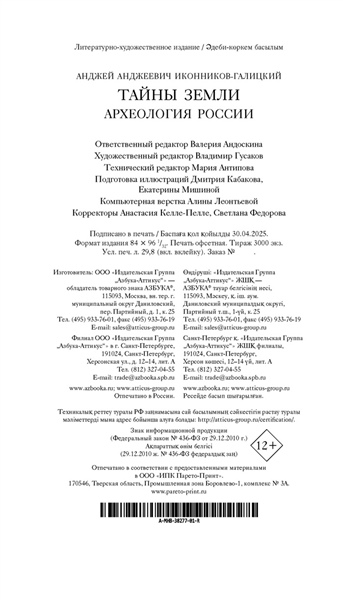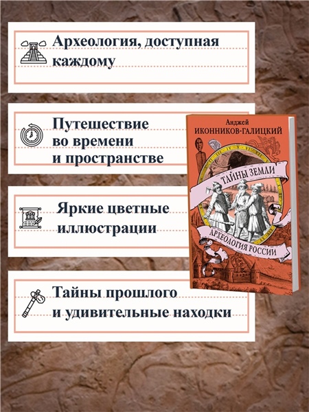 Эта книга — увлекательная экскурсия во времени и пространстве, на полтора миллиона лет назад и на многие тысячи километров. Тайны прошлого скрыты в недрах земли по всей России: среди северных лесов и южных степей, в Сибири и Поволжье, на Кавказе и Алтае, у черноморского побережья, в Москве и Санкт-Петербурге. Удивительные находки — предметы быта и подлинные шедевры искусства — помогают больше узнать об истории цивилизации, а подчас ставят перед учеными загадки. Костёнки под Воронежем, Шигирский идол в Екатеринбурге, Майкопский курган, окуневские стелы в Абакане, клады скифов, древние города Крыма... За археологическими сокровищами не нужно ехать за тридевять земель — они совсем рядом! «Археология — не только наука, но склад личности и образ жизни», — говорит автор книги Анджей Иконников-Галицкий, известный петербургский поэт, писатель и ученый. Путешественник, побывавший в разных уголках нашей страны, и участник раскопок, он рассказывает об археологии увлекательно и интересно. «Тайны земли. Археология России» — замечательный путеводитель для всех, кто хочет узнать о загадках прошлого.
